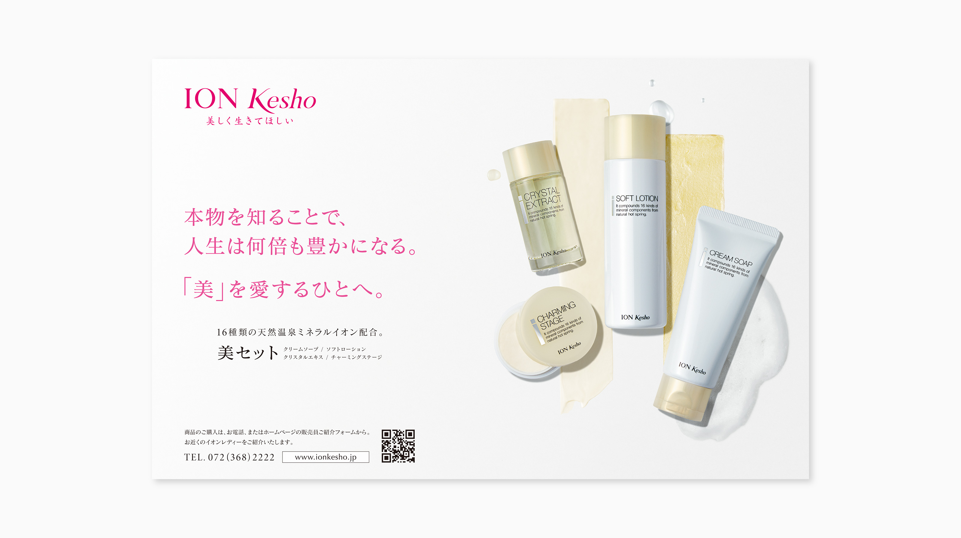 ION Kesho Client : ION Kesho AD Agency : SOBISHA Art Director : Atsushi Umezawa Photographer : Shinichi Sasaki (SIGNO) イオン化粧品「美セット」の商品広告。 パッケージだけでなく、商品の内容が分かるようにシズルを用いたビジュアル。 BACK