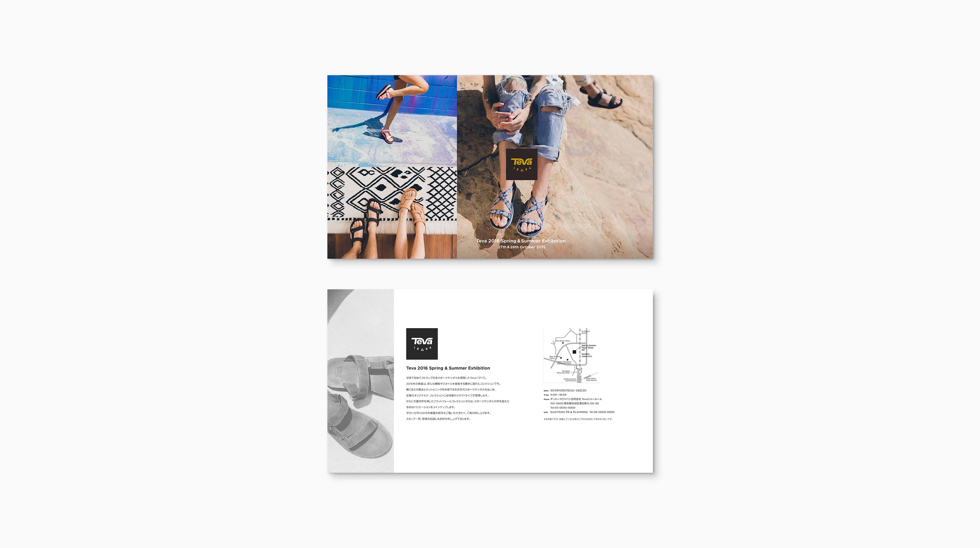 Teva Client : DECKERS Japan PR Agency : SUGIYAMA PR & PLANNING Designer : Atsushi Umezawa Tevaのシーズン展示会の案内状のデザイン。 Tevaのポジティブなメッセージとシーズンテーマを落とし込んでいる。 BACK