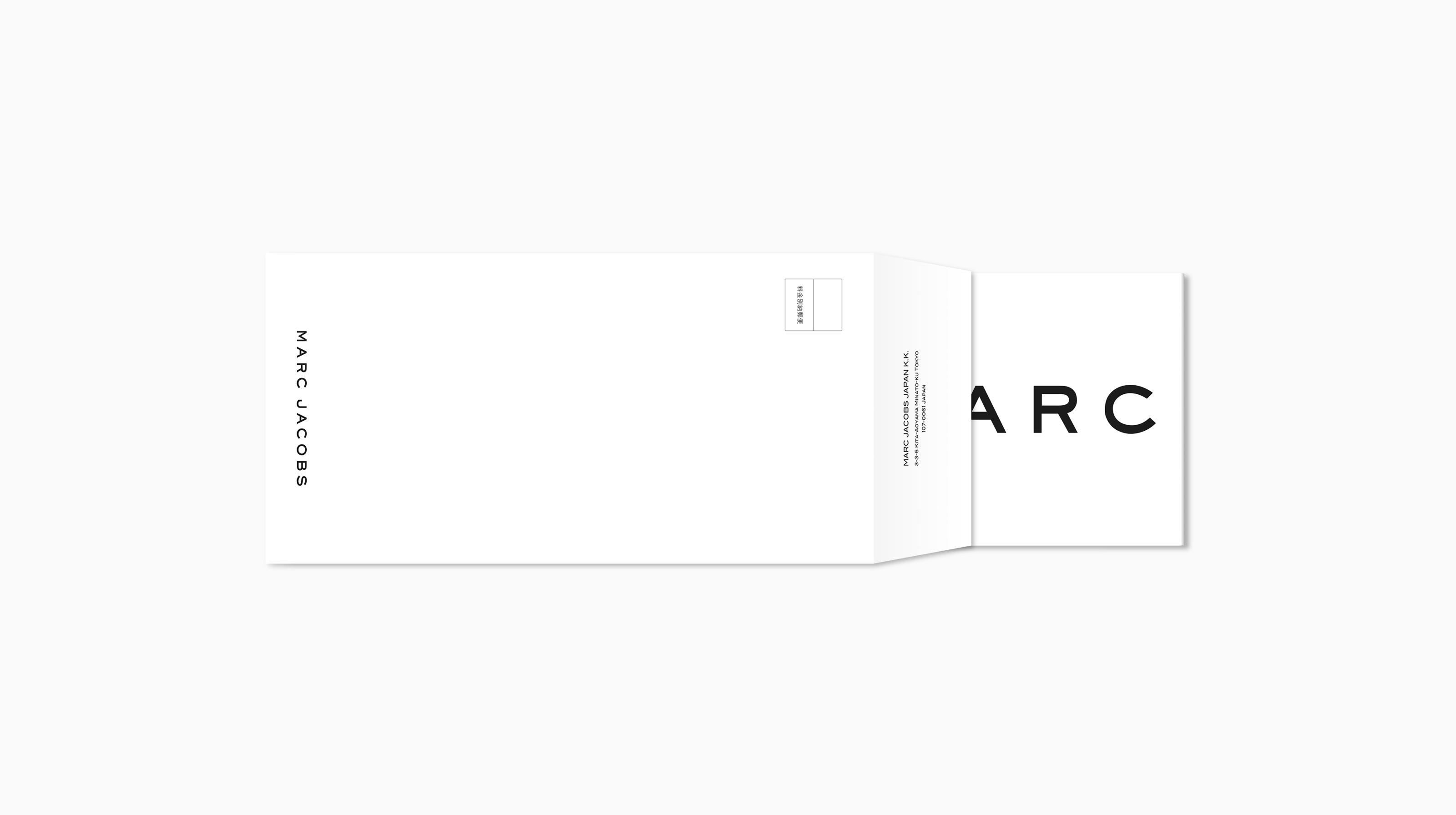 MARC JACOBS Client : MARC JACOBS JAPAN Designer : ATSUSHI UMEZAWA マークジェイコブス ジャパン株式会社設立の案内状のデザイン。 同社のブランド「MARC JACOBS」の初めての日本での発行物となるため、全体のサイズから折り目の位置まで、すべてをロゴの矩形から決定し、ブランドのスピリットを詰め込んだデザインとなっている。 BACK